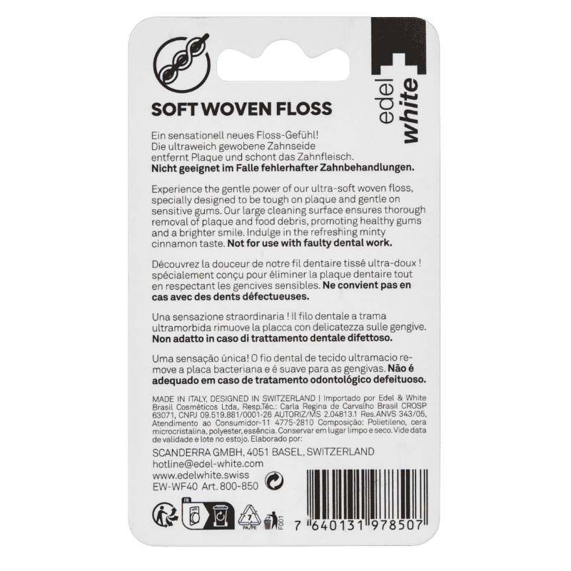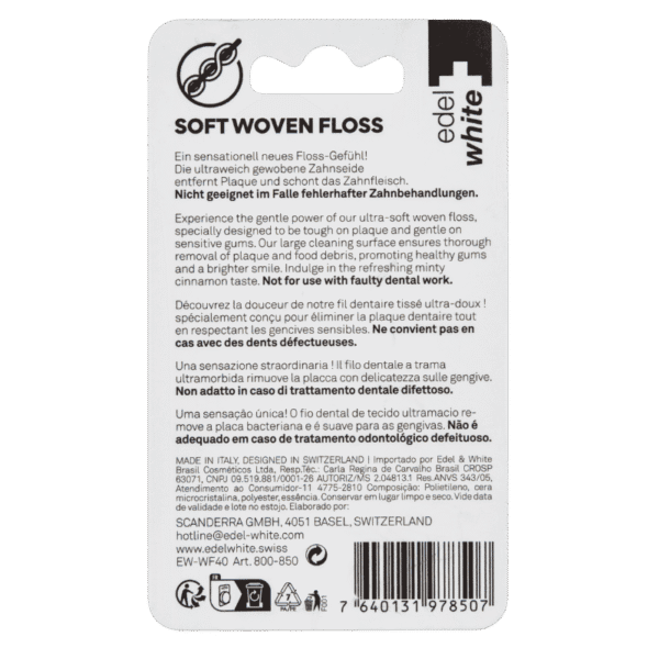 The Soft Woven Floss is an extra soft, woven dental floss with a natural cinnamon flavor. Its thicker structure removes up to 70 % more plaque* and feels particularly gentle – ideal for sensitive gums and wide interdental spaces. It expands on contact with saliva and provides a pleasant feeling of freshness. Not suitable for braces or implants.