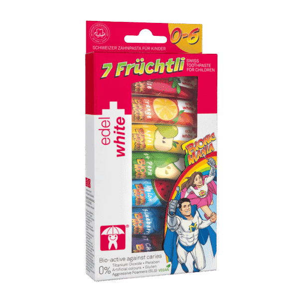 The 7 Früchtli children’s toothpaste from edel+white. Tested and recommended by Aktion Zahnfreundlich (Tooth Friendly Campaign).