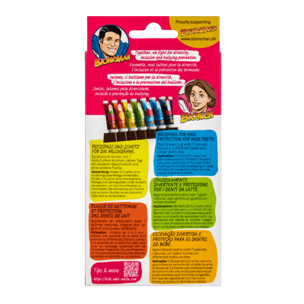 A superhero smile every day. A unique pack of 7 toothpastes that strengthen children’s teeth and bring fun and knowledge to daily tooth brushing.