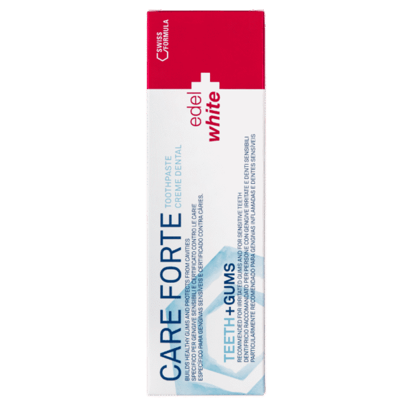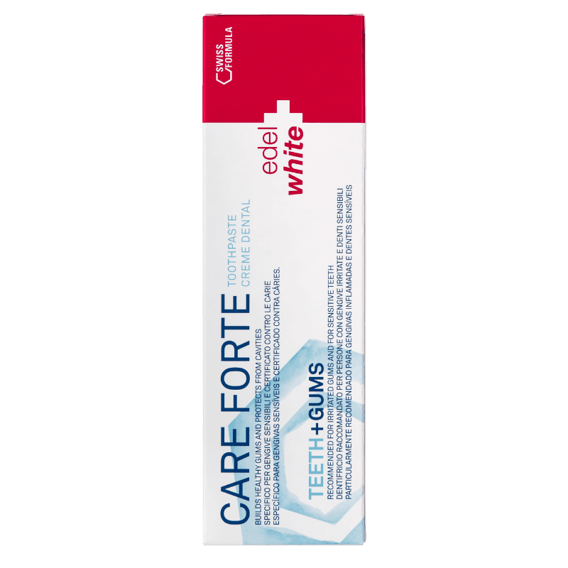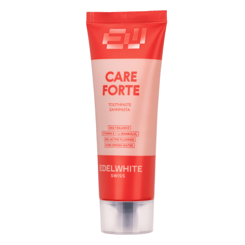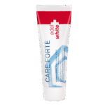 Le dentifrice polyvalent Care Forte atténue sensiblement les signes de gingivite, renforce les dents et les gencives et protège efficacement contre les nouveaux troubles. Des ingrédients de haute qualité tels que l’acétate de tocophéryle (vitamine E), le ⍺-bisabolol, le lactate de calcium et le lactate d’aluminium agissent ensemble de manière ciblée : Ils apaisent les gencives sensibles, soignent les dents sensibles et aident à retrouver la blancheur naturelle de votre sourire, avec une protection immédiate et durable. Il contient également du fluor biodisponible (1450ppm) pour une reminéralisation optimale et est exempt de SLS*, de parabènes et de dioxyde de titane. Le dentifrice Care Forte est particulièrement efficace en combinaison avec une brosse à dents sonique !