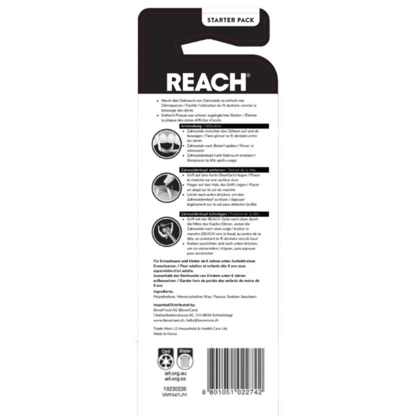 Le manche confortable, semblable à celui d’une brosse à dents, rend l’utilisation du fil dentaire aussi simple que le brossage des dents. Le col coudé facilite le nettoyage des zones difficiles à atteindre. Élimine la plaque et les résidus alimentaires entre les dents et le long du sillon gingival. Tête de fil dentaire interchangeable One-Touch : facile à recharger, hygiénique et économique. Également disponible en tant que recharge de 28 têtes de fil dentaire « One-Touch ».