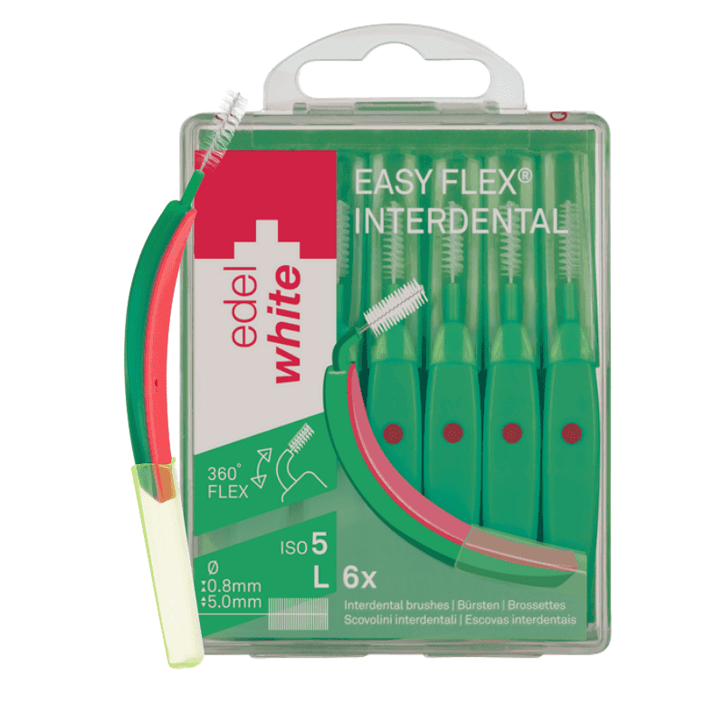 Warum eine gerade Interdentalbürste verwenden, wenn der Kiefer doch gekrümmt ist? Das war der einfache Gedanke, der die Entwicklung von EasyFlex auslöste: Eine gebogene Bürste, die sich flexibel an die Form deines Kiefers anpasst. Noch nie war die Interdentalreinigung so einfach, bequem und gründlich. Der gebogene Griff und der flexible Hals ermöglichen eine mühelose Reinigung zwischen jedem Zahn – auch zwischen den hinteren Backenzähnen.