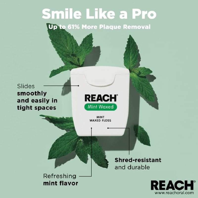 Zahnprofis empfehlen, regelmässig Zahnseide zu benutzen, um mehr Plaque zu entfernen als durch Zähneputzen allein. Das gewachste REACH Dental Floss mit Minzgeschmack ermöglicht eine mühelose Interdentalreinigung – für eine optimale Mundhygiene, einen minzig-frischen Atem und ein selbstbewusstes Lächeln.