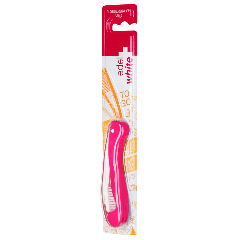 Halten deine Zähne strahlend weiss und dein Zahnfleisch gesund, während du unterwegs sind – mit der edel+white Reisezahnbürste Flosserbrush To Go Soft. Die ultrasanften und konisch zulaufenden Borsten reinigen gründlich zwischen den Zähnen und um das Zahnfleisch herum. Unsere konischen Konex HD®-Borsten sind fünfmal feiner als normale ultraweiche Borsten und fünfmal haltbarer als herkömmliche Zahnbürsten.